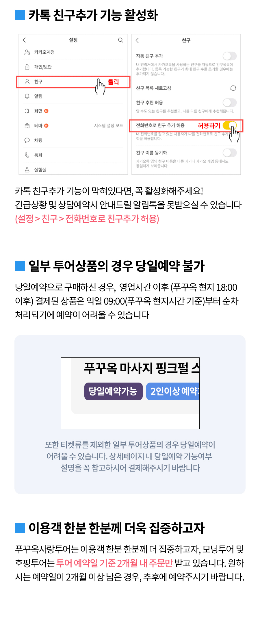 - 단독 투어로, 사전에 말씀 주시면 코스 내에서 약간의 변경이 가능합니다. 단 마사지 예약 시간 및 숙소 드랍 시간은 변경이 불가합니다.