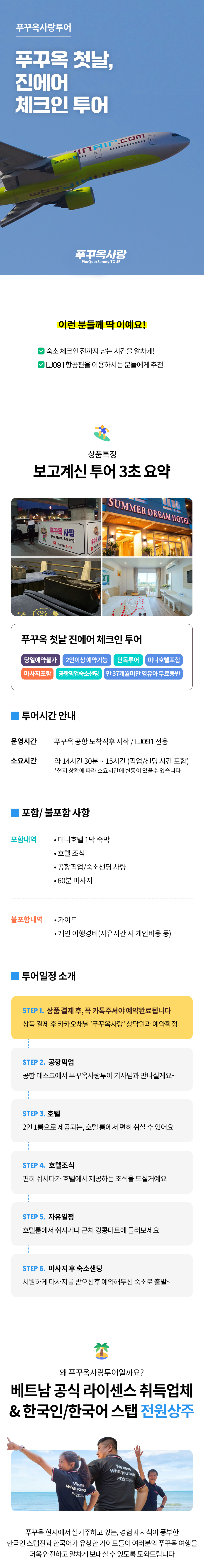 안녕하세요 Xin Chao! 여러분의 푸꾸옥 여행을 도와드릴 푸꾸옥 전문 자유여행사 푸꾸옥사랑투어 입니다. ✅ 숙소 체크인 전까지 남는 시간을 알차게! ✅ LJ091 항공편을 이용하시는 분들에게 추천 ✅ 호텔 조식 / 1박 숙박권 포함 ✅ 차량과 운전기사, 마사지60분 포함 ✅ 식사 및 마트 등 개별비용 별도 진에어로 푸꾸옥에 도착하시는 여행객들에게 추천하는 푸꾸옥사랑투어 추천상품, '푸꾸옥 진에어 체크인 투어' 입니다😊