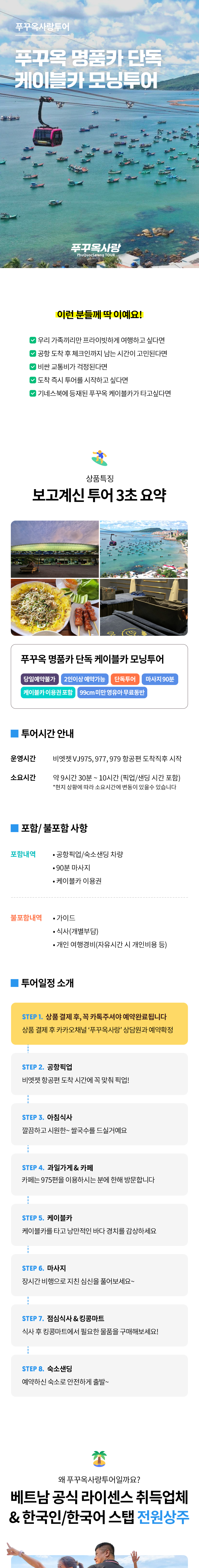 안녕하세요 Xin Chao! 여러분의 푸꾸옥 여행을 도와드릴 푸꾸옥 전문 자유여행사 푸꾸옥사랑투어 입니다. ✅ 숙소 체크인 전까지 남는 시간을 알차게! ✅ VJ975, VJ977, VJ979 항공편을 이용하시는 분들에게 추천 ✅ 케이블카 이용권 포함 ✅ 차량과 마사지90분 포함 ✅ 식사, 마트 등 개별비용 별도 공항부터 일행끼리만 단독차량으로 여행하시기 원하시는분들께 추천하는 푸꾸옥사랑투어 추천상품, '푸꾸옥 명품카 단독 케이블카 모닝투어' 입니다😊 🔴 예약 진행관련 안내 푸꾸옥사랑투어는 이용객 한분 한분께 더욱 집중하고자, 모닝투어 및 호핑투어는 투어 예약일 기준 2개월 내 주문만 받고 있습니다. 원하시는 예약일이 2개월 이상 남은 경우, 추후에 예약주시기 바랍니다.