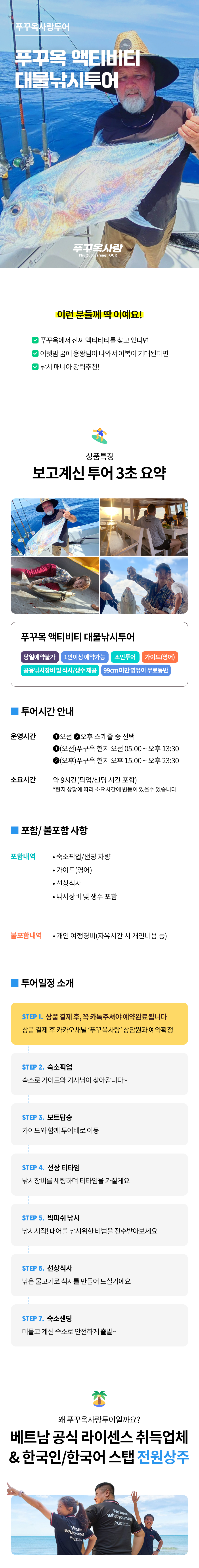 안녕하세요 Xin Chao! 여러분의 푸꾸옥 여행을 도와드릴 푸꾸옥 전문 자유여행사 푸꾸옥사랑투어 입니다. ✅ 낚시매니아 강력추천! ✅ 가이드(영어)와 운전기사가 포함됩니다 ✅ 투어배 및 차량과 식사 포함 ✅ 낚시장비 및 생수 포함 ⏰ 투어시간 안내 : 푸꾸옥 현지시각 (오전)05:00~13:30 (오후)15:00~23:30 중 선택 푸꾸옥 바다에서 꽝치지 않을 자신있는 어복 충만한 여행객들에게 추천하는 푸꾸옥사랑투어 추천상품, '푸꾸옥 빅피쉬 낚시투어' 입니다😊 🔴 예약 진행관련 안내 푸꾸옥사랑투어는 이용객 한분 한분께 더욱 집중하고자, 모닝투어 및 호핑투어는 투어 예약일 기준 2개월 내 주문만 받고 있습니다. 원하시는 예약일이 2개월 이상 남은 경우, 추후에 예약주시기 바랍니다.