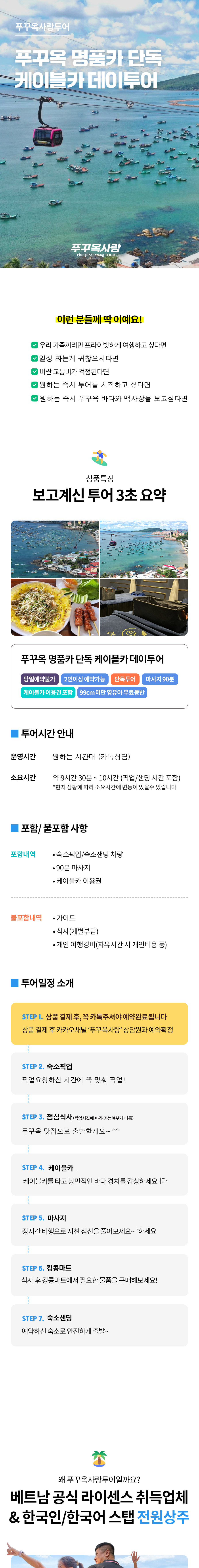 안녕하세요 Xin Chao! 여러분의 푸꾸옥 여행을 도와드릴 푸꾸옥 전문 자유여행사 푸꾸옥사랑투어 입니다. ✅ 우리끼리 프라이빗하게! ✅ 투어 일정 짜시기 귀찮으시 분! ✅ 케이블카 이용권 포함 ✅ 차량과 마사지90분 포함 ✅ 식사, 마트 등 개별비용 별도 공항부터 일행끼리만 단독차량으로 여행하시기 원하시는분들께 추천하는 푸꾸옥사랑투어 추천상품, '푸꾸옥 명품카 단독 케이블카 데이투어' 입니다😊 🔴 예약 진행관련 안내 푸꾸옥사랑투어는 이용객 한분 한분께 더욱 집중하고자, 모닝투어 및 호핑투어는 투어 예약일 기준 2개월 내 주문만 받고 있습니다. 원하시는 예약일이 2개월 이상 남은 경우, 추후에 예약주시기 바랍니다.